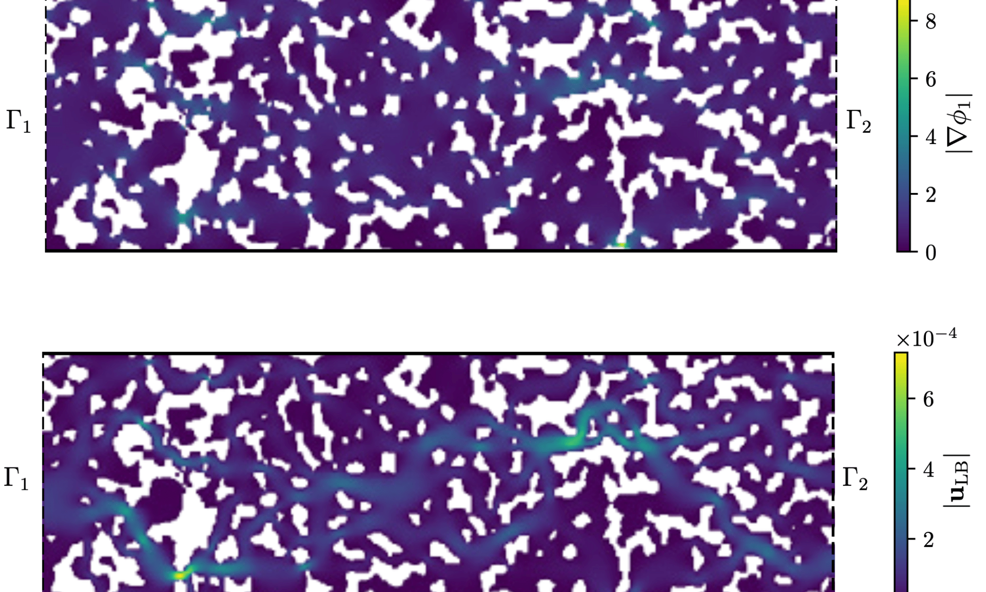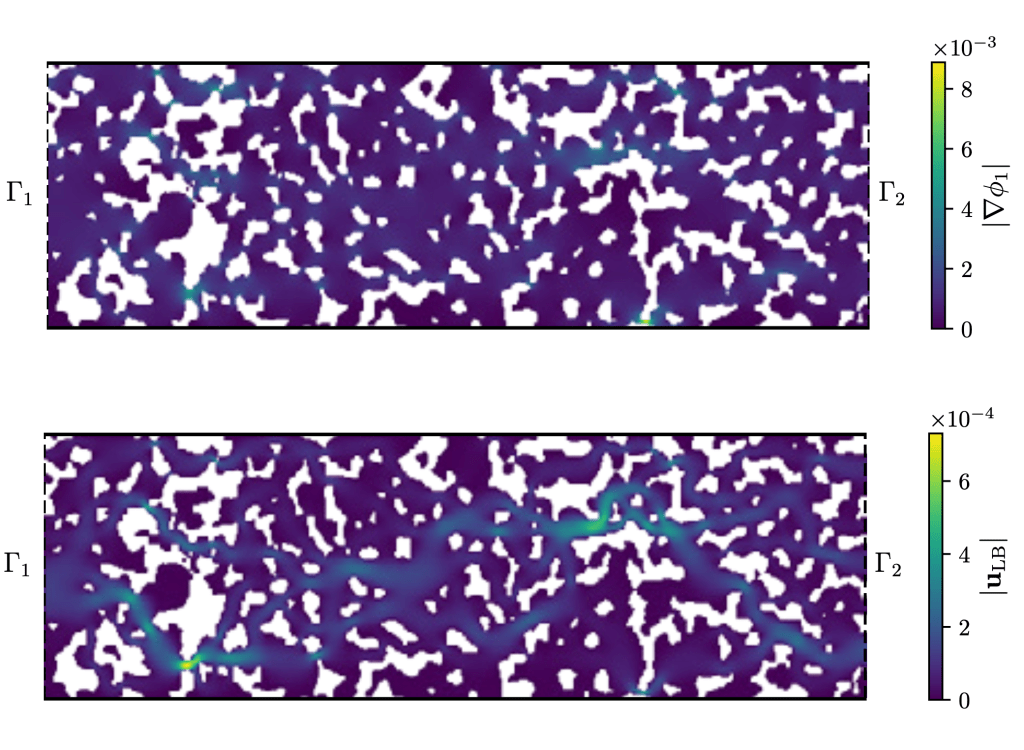 The top subfigure shows the magnitude of a force field representing a pressure driven flow. Note how the force magnitude adapts to the pore geometry. The bottom subfigure shows the associated velocity field.